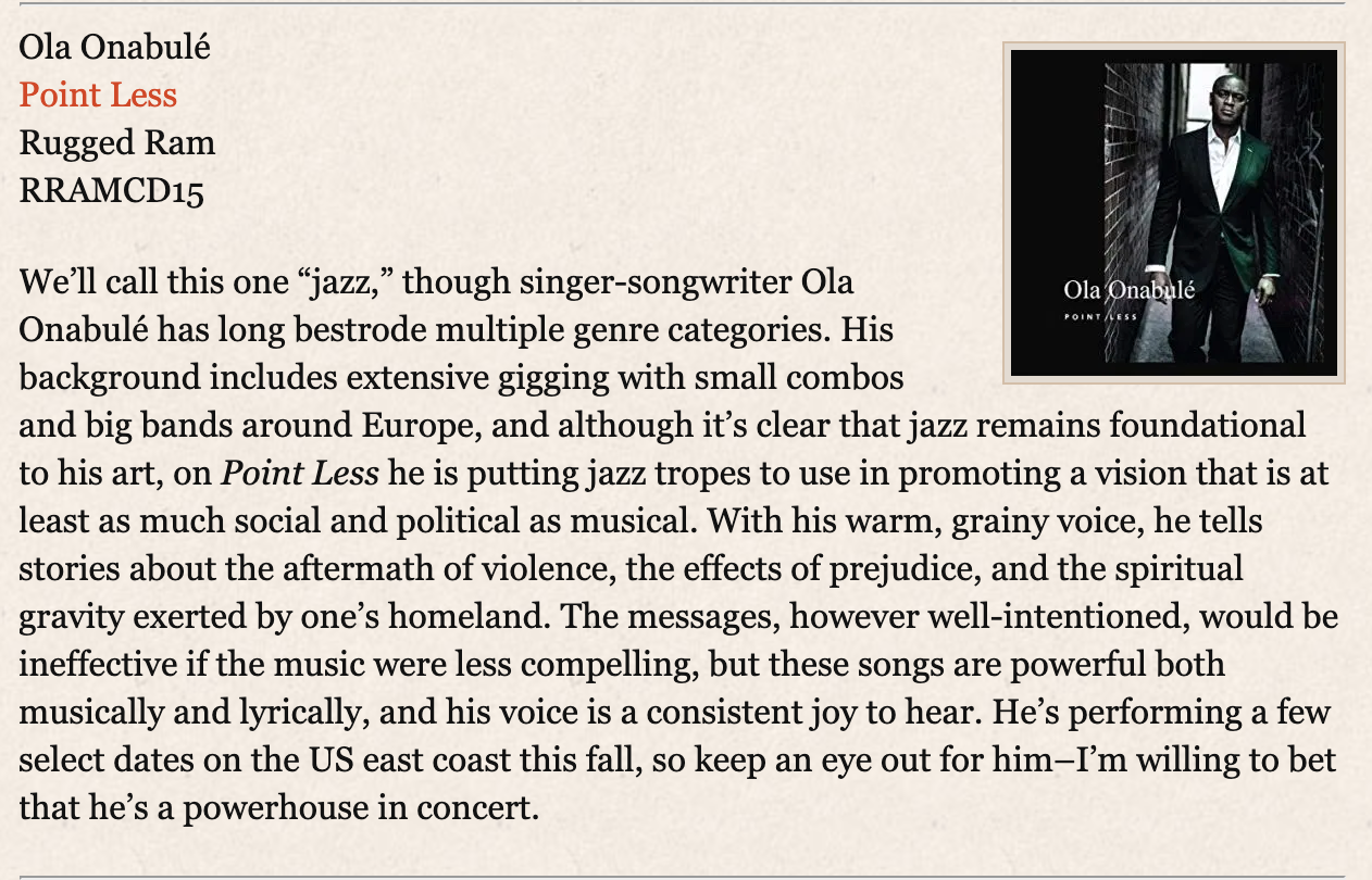 Ola Onabulé featured in Marc Myers' esteemed jazz newsletter.